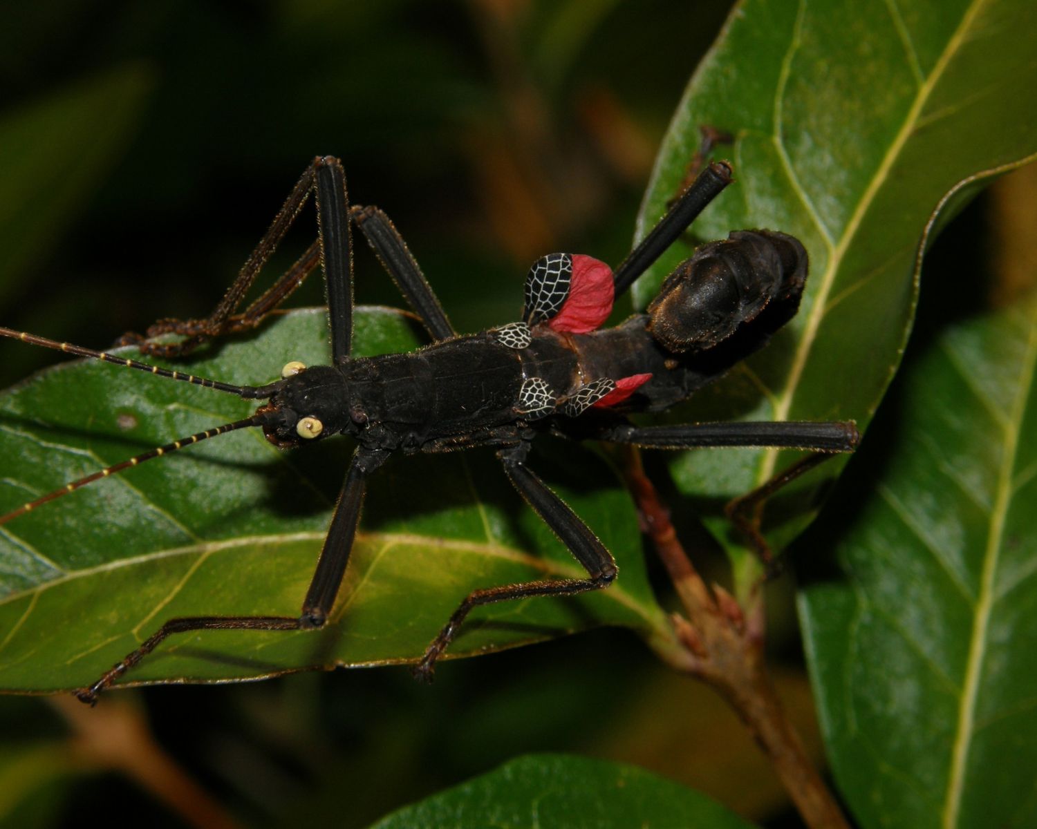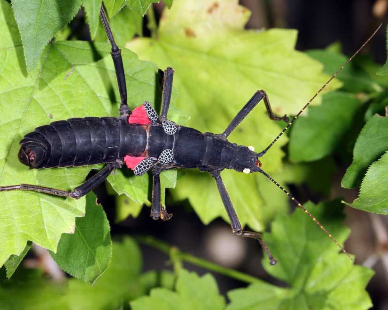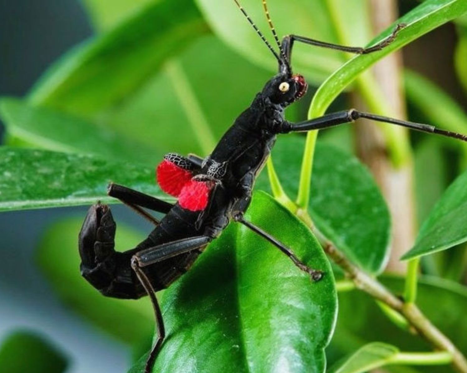 Phasme Peruphasma schultei est originaire du nord du Pérou. C’est un magnifique phasme au corps noir satiné, qui a les yeux jaunes et les ailes postérieures rouges.